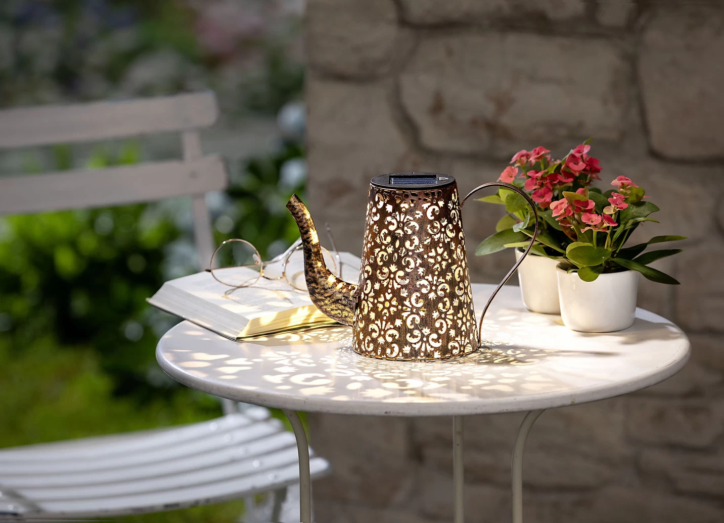 Sorgen Sie für stimmungsvolle Atmosphäre auf Balkon oder Terrasse. Platzieren Sie diese Solar-Teekanne nach Einbruch der Dämmerung an exponierter Stelle, am effektivsten vor einer Wand. Das durch die ausgestanzten Ornamente durchscheinende Licht der LEDs sorgt für ein geheimnisvolles Schattenspiel. Aus Eisen. Maße: B24xH17 cm, ø 12 cm.