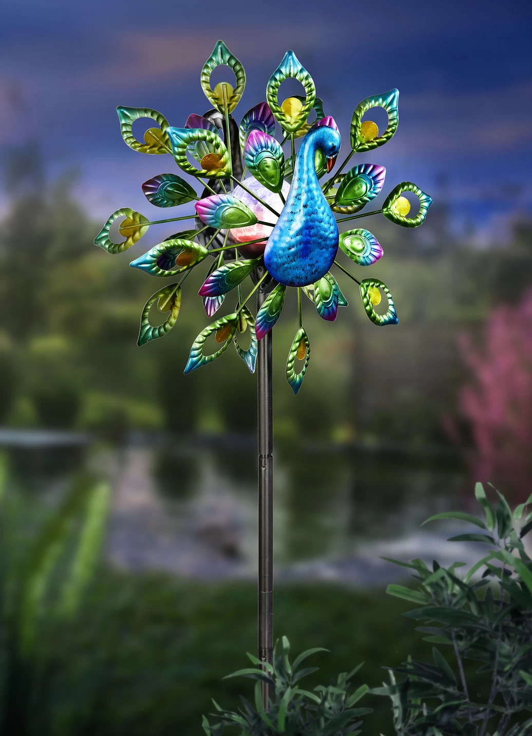 Solar-Windrad Pfau mit Solarkugel in der Mitte in Bunt.