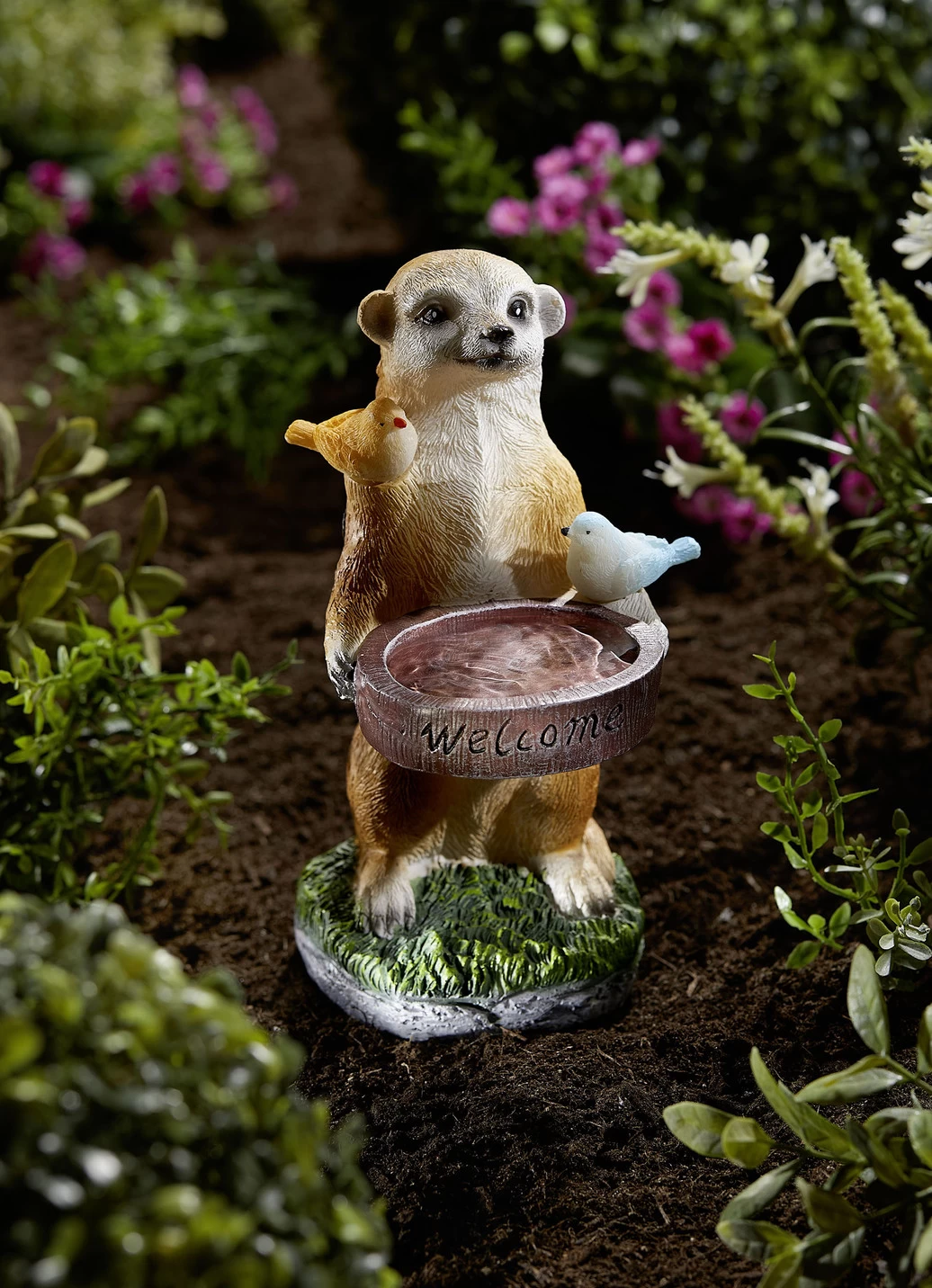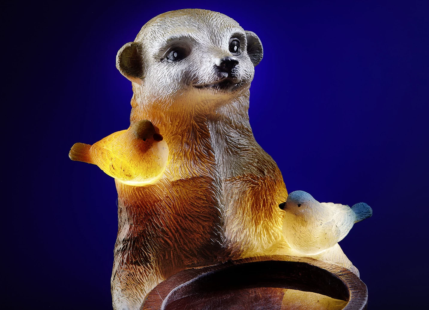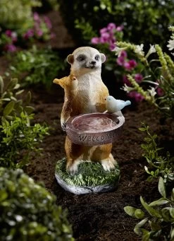 Liebevoll gestaltete Vogeltränke aus Polyresin. Stolz hält das Erdmännchen die Tränke, während es sich 2 Vögelchen auf ihm gemütlich gemacht haben, die nach Einbruch der Dämmerung warmweiß zu leuchten beginnen. Leuchtdauer 6–8 Stunden bei voller Aufladung.
