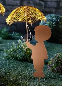 Solarstecker aus Metall in der Ausführung Junge mit Solarschirm und in Braun-Gelb.