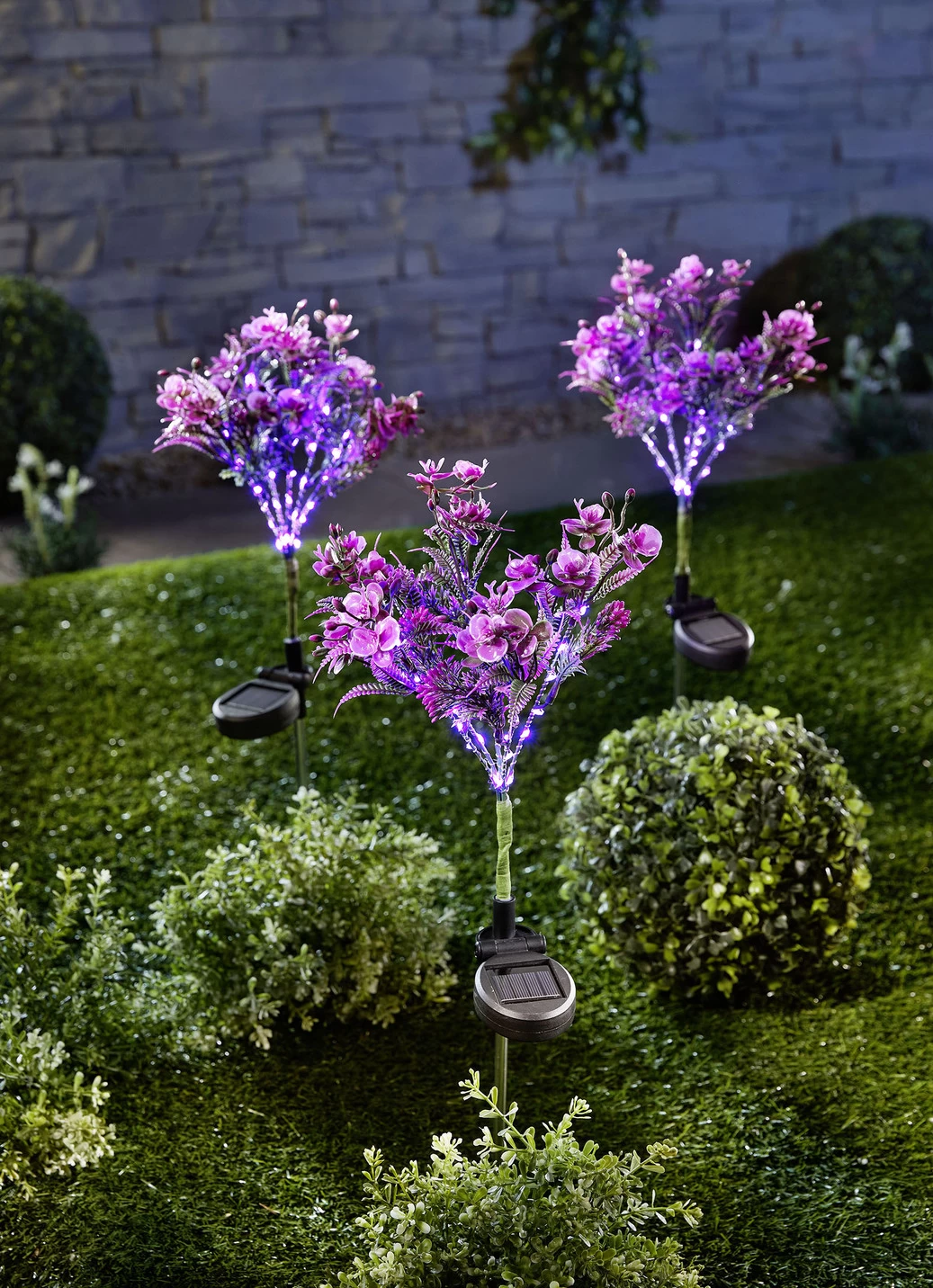 Bei Nacht sind diese Blützenzweige ein charmanter Blickfang und auch tagsüber werden Sie bewundernde Blicke auf sich ziehen. Tagsüber lädt sich der integrierte Akku über das Solarmodul mit kostenloser Sonnenenergie auf. Bei Einbruch der Dämmerung schalten sich die 28 LEDs automatisch ein und lassen die Blüten spektakulär erstrahlen. Gesamthöhe 58 cm