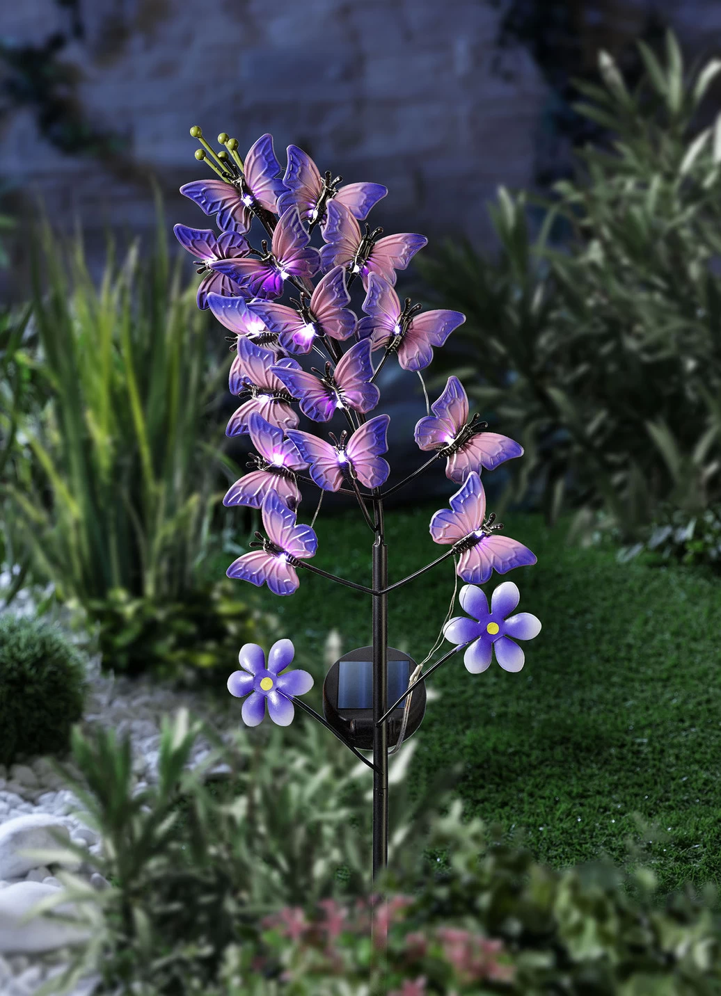 Wie ein Palmwedel erstrahlt dieser Solarstecker, der mit 20 Schmetterlingen bestückt ist. Diese erleuchten bei Einbruch der Dämmerung und setzen schöne Blickpunkte in Ihrem Garten oder Blumenbeeten. Aus Metall. Maße: Breite 19 cm, Gesamthöhe 75 cm