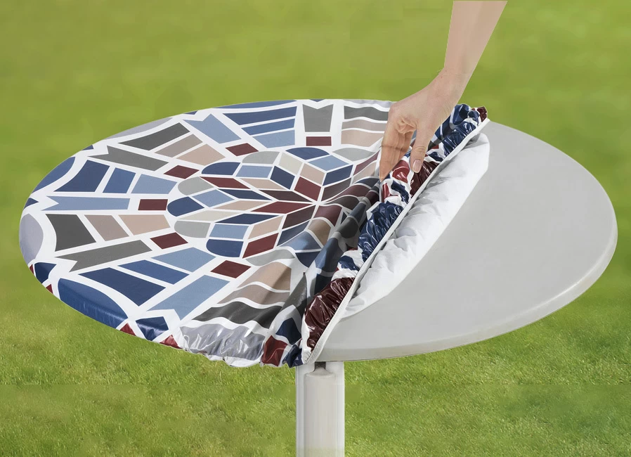 Spann-Tischdecke mit Mosaik-Dessin in Größe 150 (ø 70–86 cm) und in Blau.