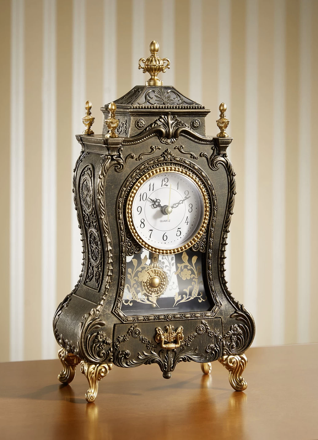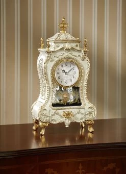 Diese hübsche Kaminuhr in antiker Verkleidung besticht durch viele kleine Details. Verziert ist die Standuhr mit goldfarbenen Ornamenten. In der integrierten Schublade können Sie kleine Kostbarkeiten aufbewahren. Wenn man die Schublade öffnet und das mechanische Spielwerk am Rücken der Uhr mit dem Schlüssel aufgezogen hat, ertönt die Melodie Zauberflöte. Batteriebetrieben mit 1x 1,5 Volt Mignon (nicht im Lieferumfang enthalten).