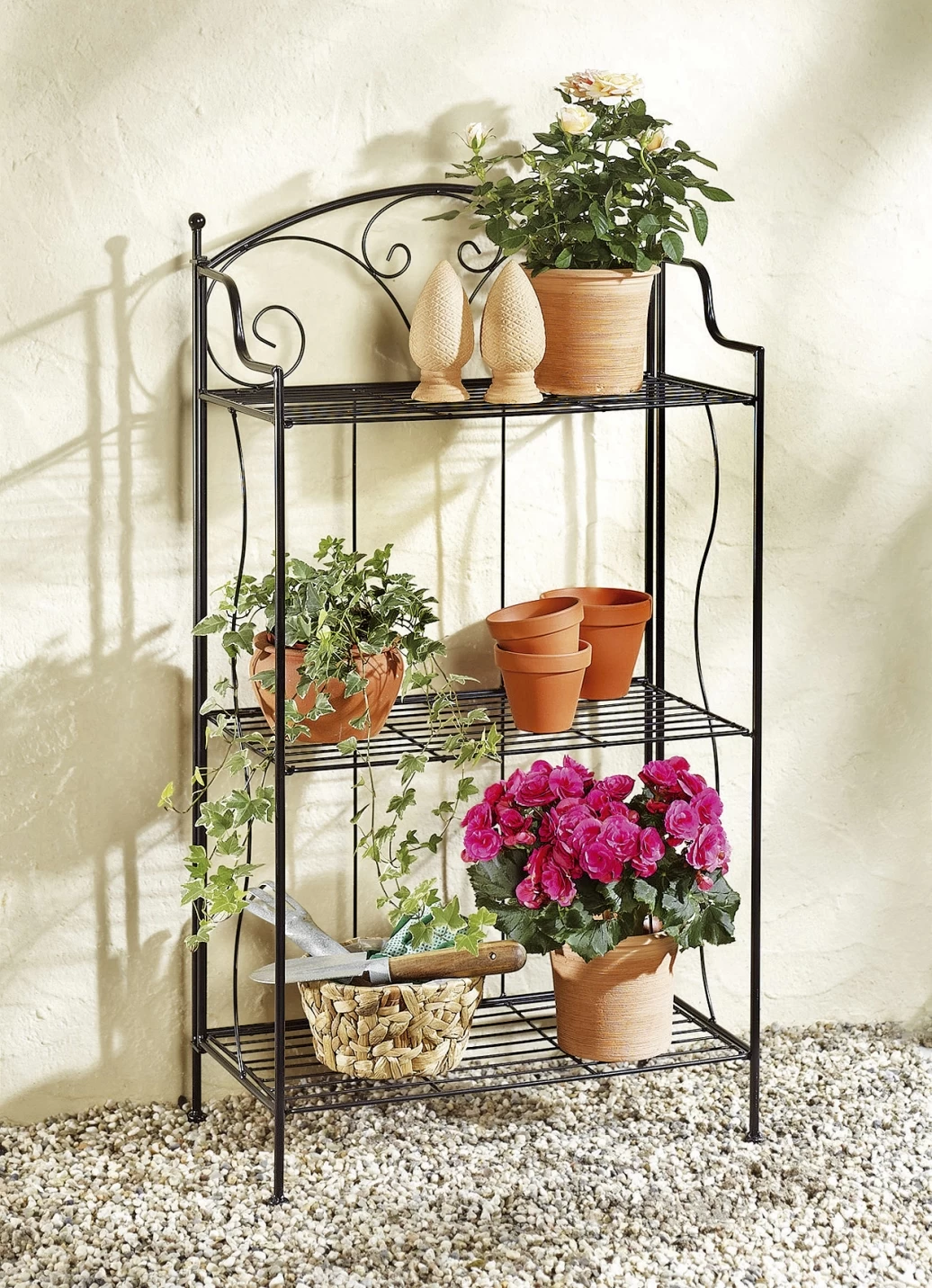 Vielseitiges Regal aus mattschwarz lackiertem Stahl. Mit 3 Böden, die aus mehreren Eisensträngen bestehen. Zur platzsparenden Aufbewahrung lässt sich das Regal schmal zusammenklappen.