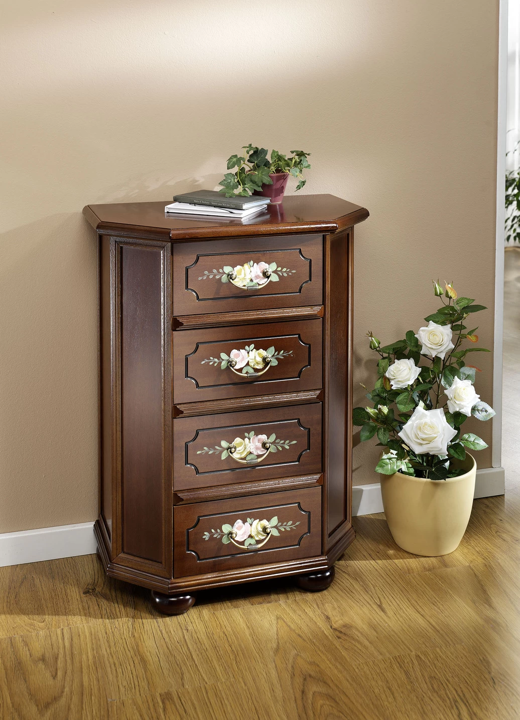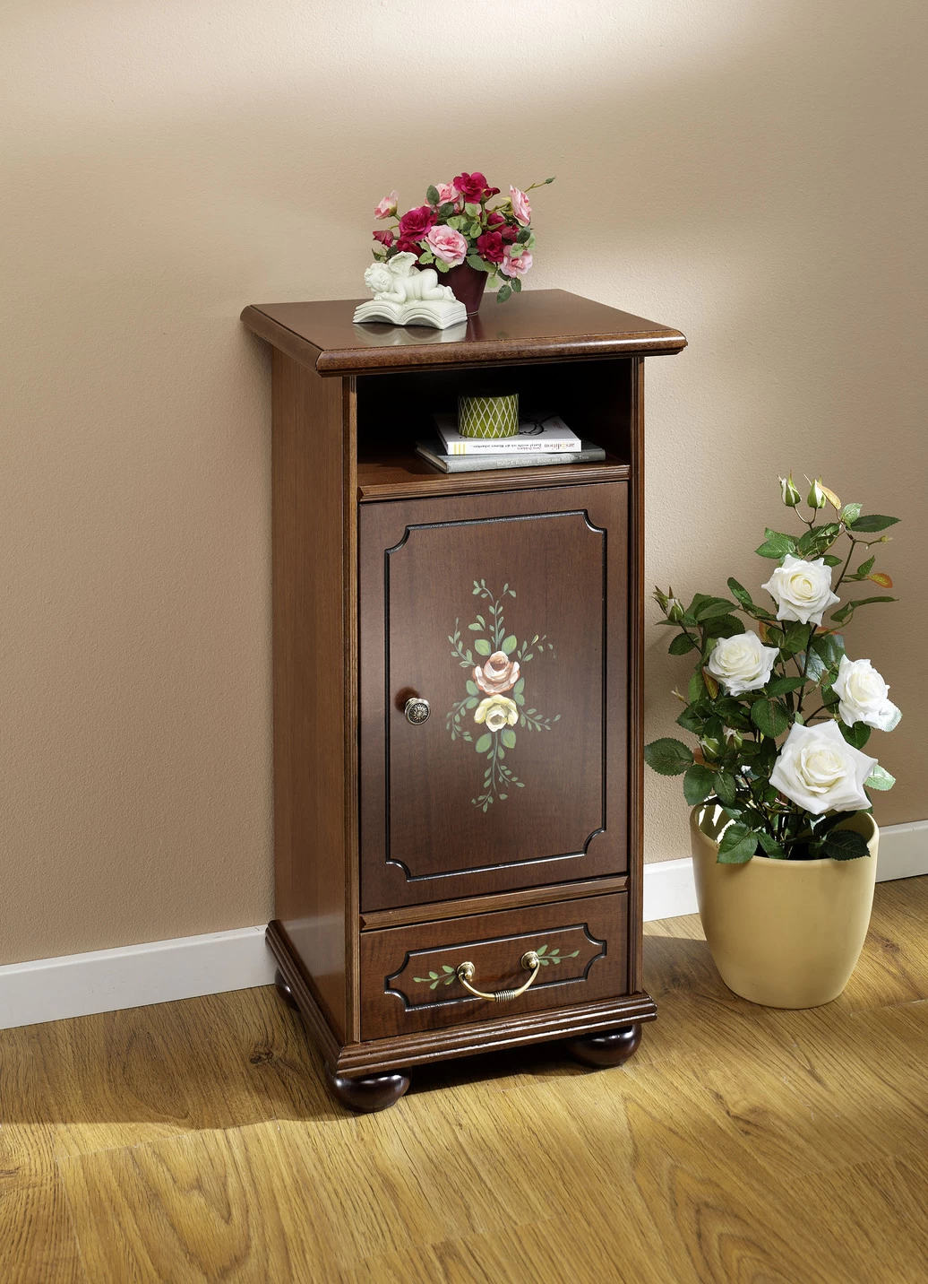 Stilvoller Kommode mit handbemalter Blumendekoration in der Ausführung Kommode, 1-türig und in Nussbaum.