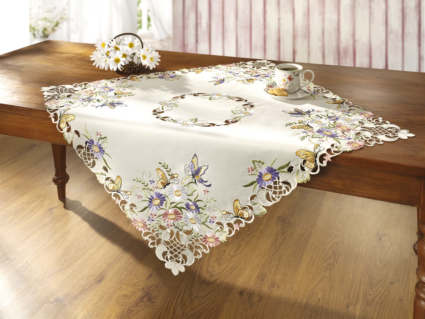 Einen zarten Hauch von Frühling verbreiten die Blüten- und Schmetterlings-Motive dieser fein gearbeiteten Tisch- und Raumdekoration. Aus 100% Polyester. Waschbar bis 30 °C.
