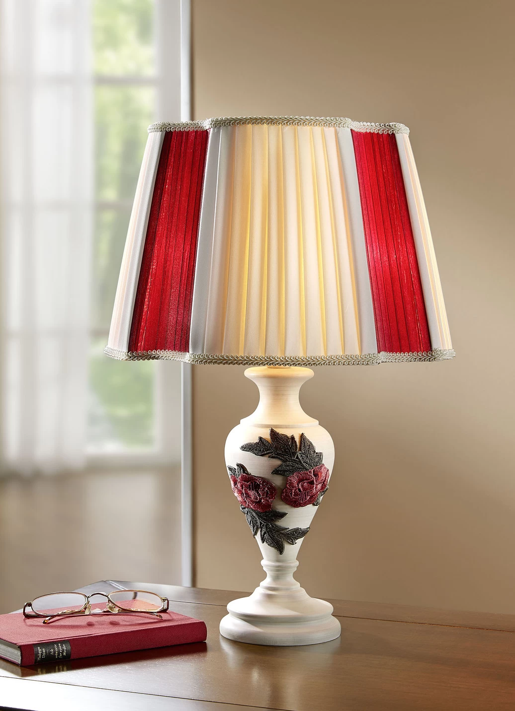 Diese klassisch schöne Tischleuchte erhellt auch den dunkelsten Wohnraum! Der eindrucksvolle Lampenschirm wurde aus Organza (100% Viskose) und Pongé (100% Polyester) hergestellt. Der kunstvoll gearbeitete Fuß ist aus massivem Erlenholz in Cremefarben und mit hübschen, bestickten Rosen-Motiven (100% Baumwolle) geschmückt. Fassung 1x E27, max. 60 Watt. Die Lieferung erfolgt ohne Leuchtmittel. 230 Volt. Maße: ø 30 cm, Höhe 47 cm