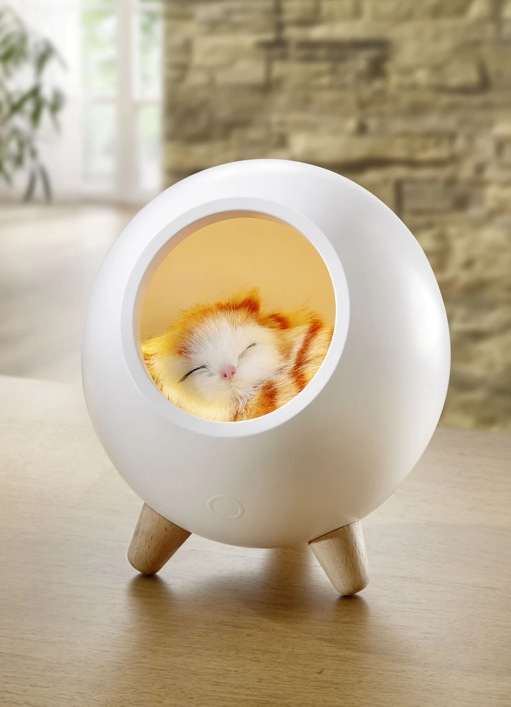 Ein liebenswerter Hingucker in Ihrem Zuhause, ob als Nachtlicht im Schlafzimmer oder als Deko-Element im Wohnzimmer. Das minimalistische Design, bestehend aus einer weißen Kugel in Kombination mit Standfüßen aus Buche, lässt sich in jeden Einrichtungsstil integrieren. Das Kätzchen ist mit einem Magneten im Körbchen befestigt und lässt sich so einfach entnehmen. 10 bernsteinfarbene LEDs lassen das Innere des Körbchens und das Kätzchen in tollem Licht strahlen.