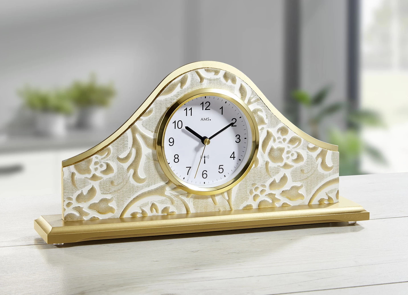 Tischuhr mit Funkuhrwerk in Gold-Weiss.