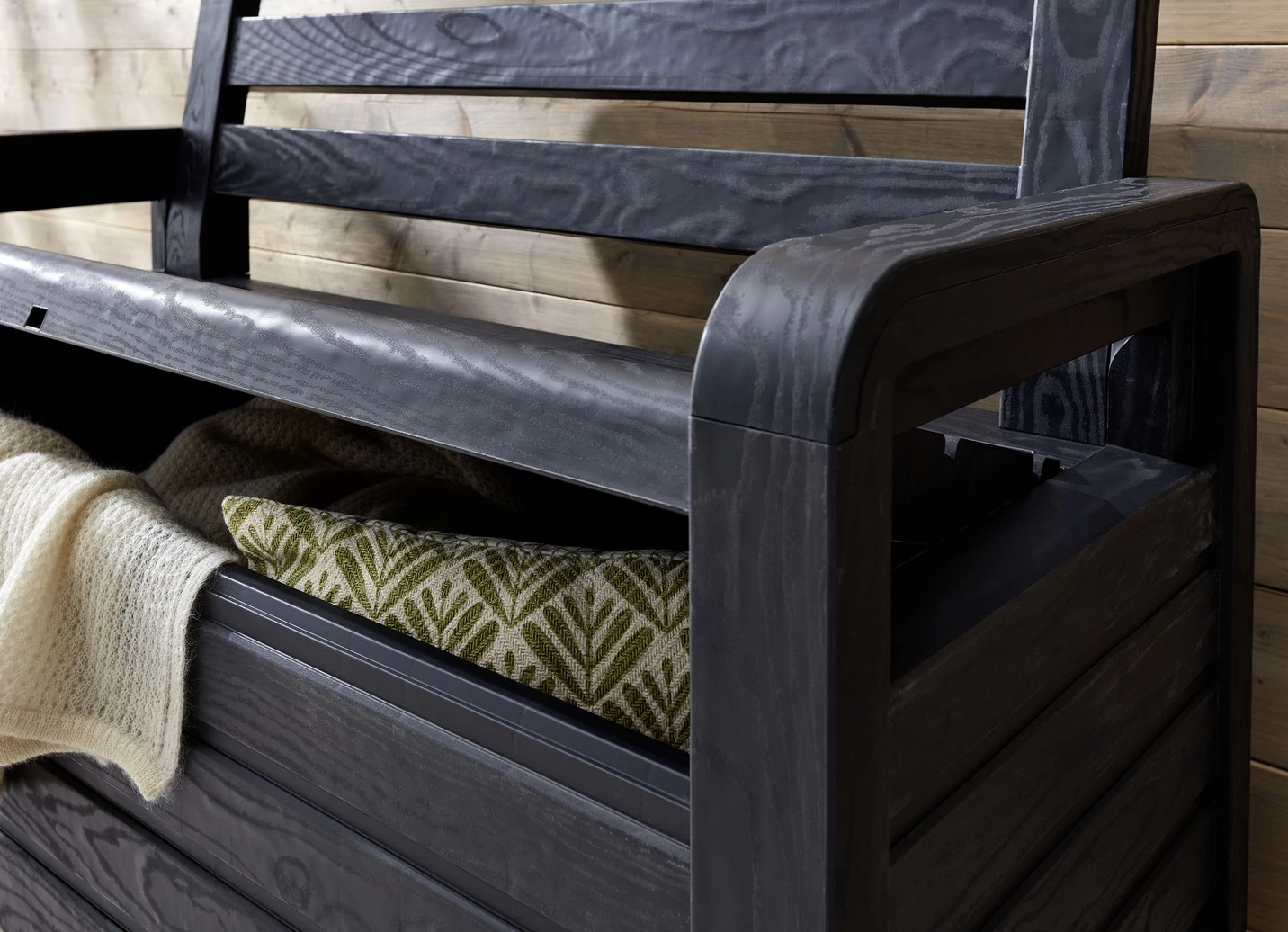 Sie sieht einer echten Holz-Gartenbank zum Verwechseln ähnlich, ist aber aus hochwertigem UV-beständigem Kunststoff gefertigt. Wetterfester Stauraum, stabile Sitzgelegenheit und dekoratives Einrichtungselement – alles vereint in dieser schönen Gartenbank.