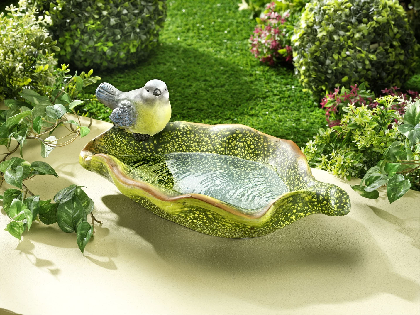 Vogeltränke Blaumeise aus hochwertiger Keramik in Grün.