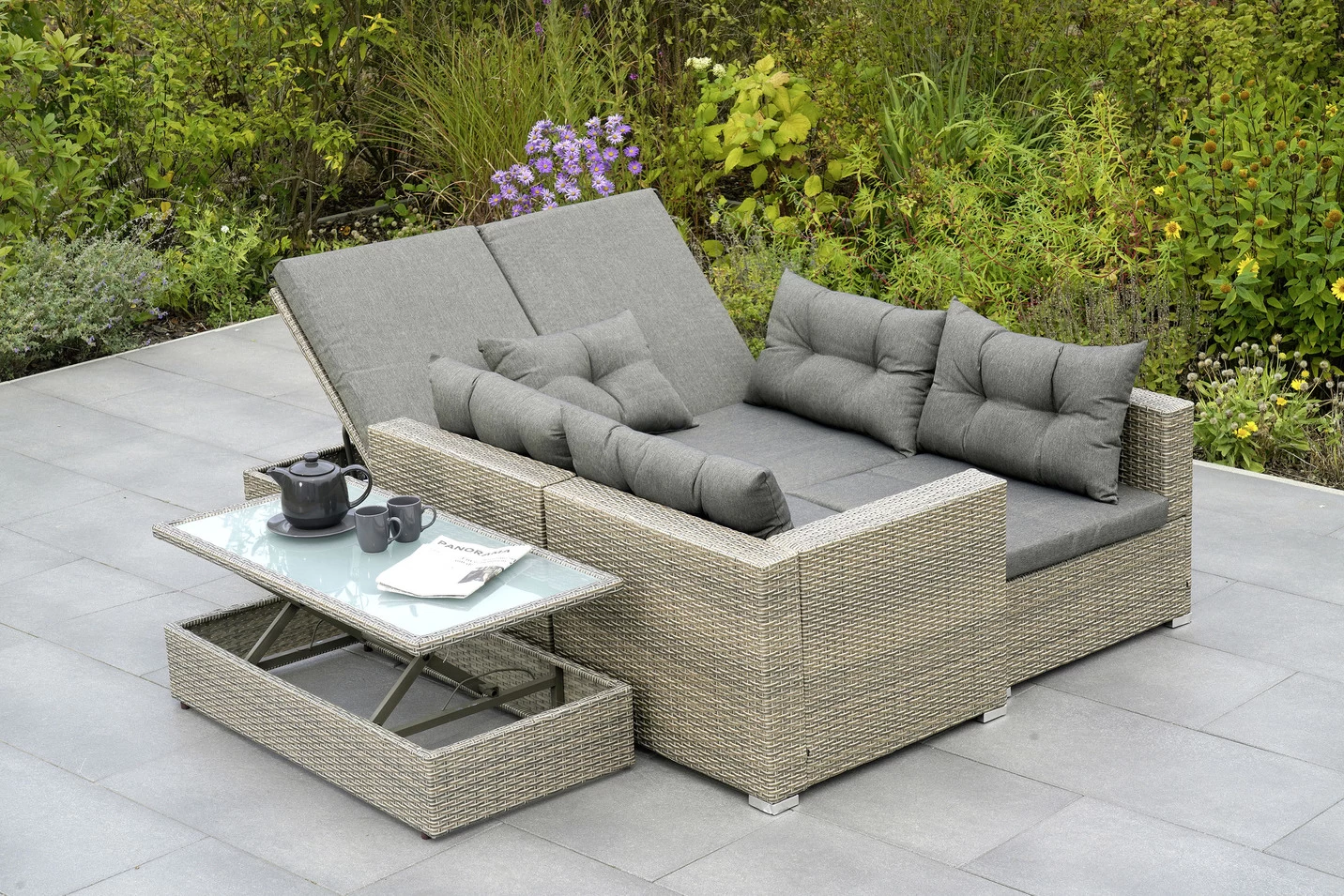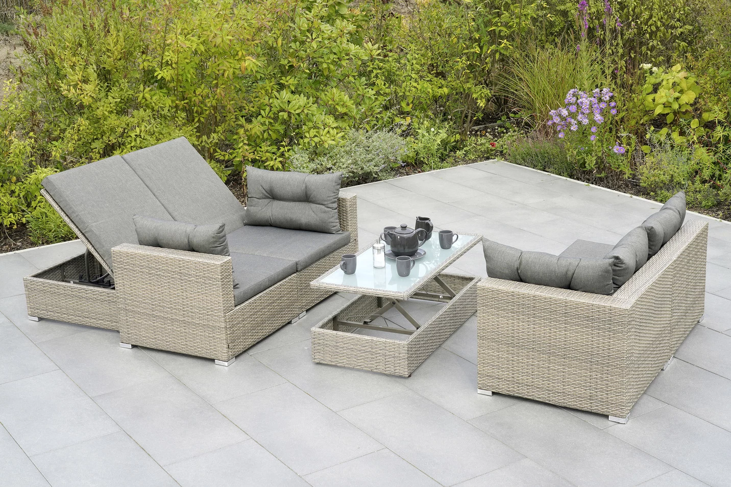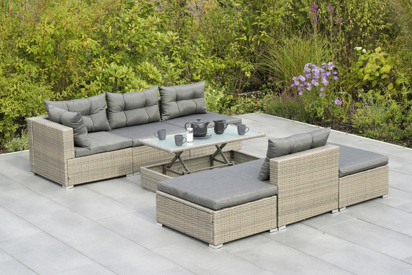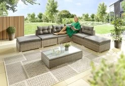 Die Multifunktionslounge „Manzano“ überzeugt nicht nur durch geradliniges, elegantes Design, sondern vor allem auch durch maximale Wandlungsfähigkeit mit vielfachen Kombinationsmöglichkeiten zu einem günstigen Preis. 6 Sitzelemente (4x mit Rückenlehne, 2x ohne Rücken lehne mit verstellbarer Sitzfläche) lassen sich ganz nach Wunsch arrangieren. Entscheiden Sie selbst, ob z.B. als großzügige Ecklounge, entspannte Sonneninsel oder um den höhenverstellbaren Glastisch arrangierte Sitzgruppe in unterschiedlichen Kombi nationen.