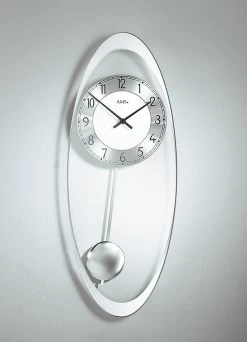Formschöne, ovale Wanduhr aus hochwertigem Mineralglas. Das Zifferblatt aus Aluminium ist mit arabischen Ziffern und schwarzen Metallzeigern versehen. Mit hochwertigem Quartzwerk sowie Pendel. Hergestellt in Deutschland. Batteriebetrieben mit 1x 1,5 Volt Mignon (nicht im Lieferumfang enthalten).