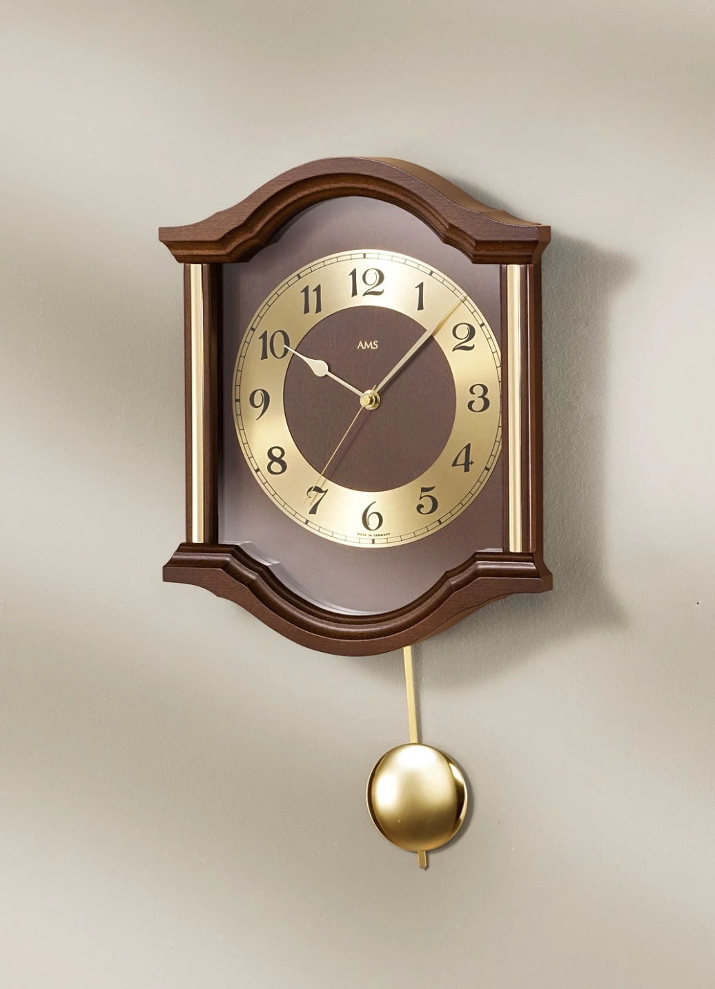 Ein wahrer Blickfang an Ihrer Wand wird diese tolle, formschöne Wanduhr sein! Aus Holz gefertigt und ausgestattet mit Mineralglasabdeckung, dekorativen, messingfarbenen Applikationen, rundem Metall-Zahlenreif, arabischen Ziffern, messingfarbenen Zeigern, Pendel sowie Funkuhrwerk. Batteriebetrieben mit 2x 1,5 Volt Mignon (nicht im Lieferumfang enthalten). In 3 Farben