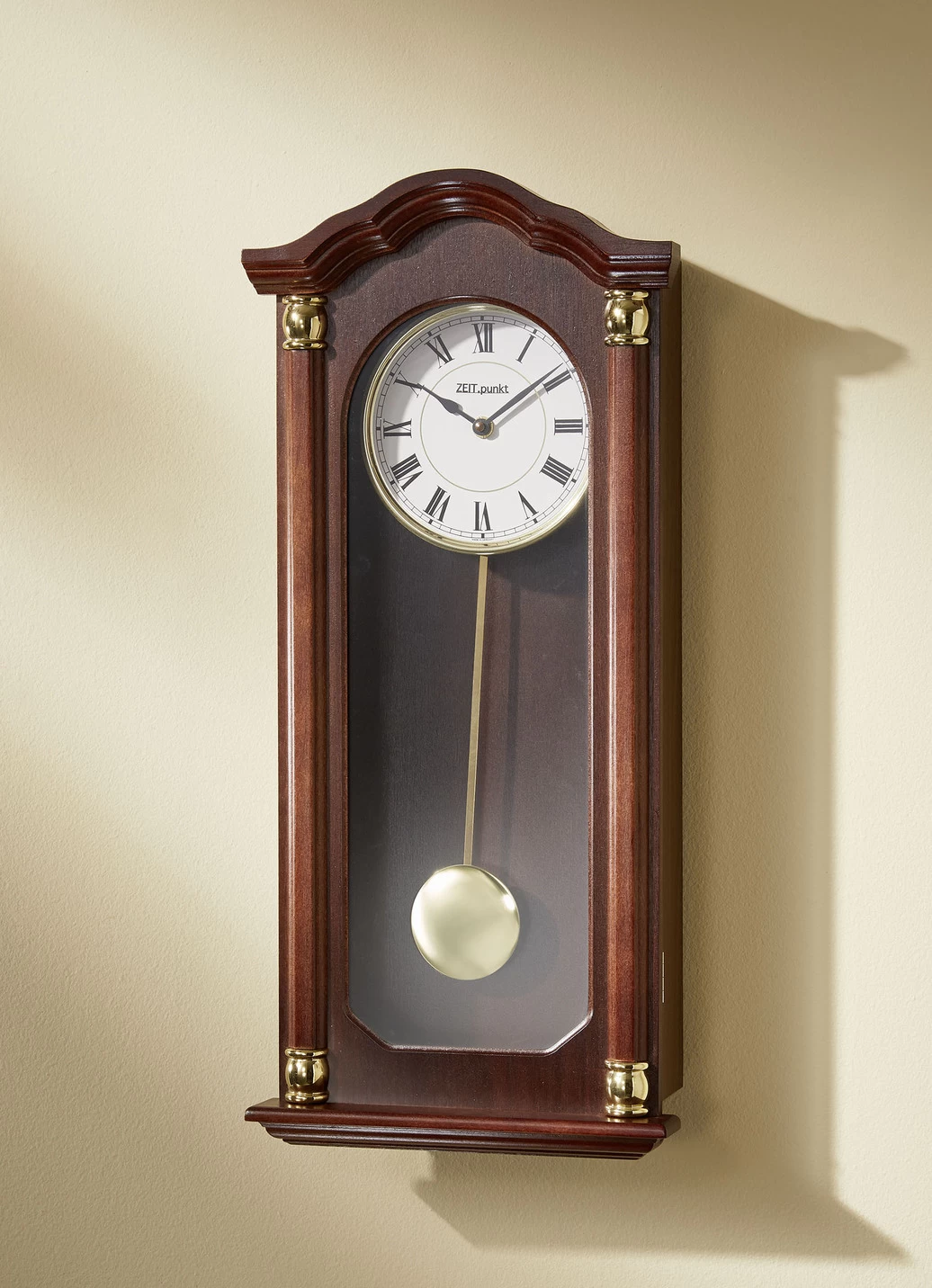 Mit goldfarbenem Metall-Pendel und Glasabdeckung. Quarzwerk batteriebetrieben mit 2x 1,5 Volt Mignon (nicht im Lieferumfang enthalten).
