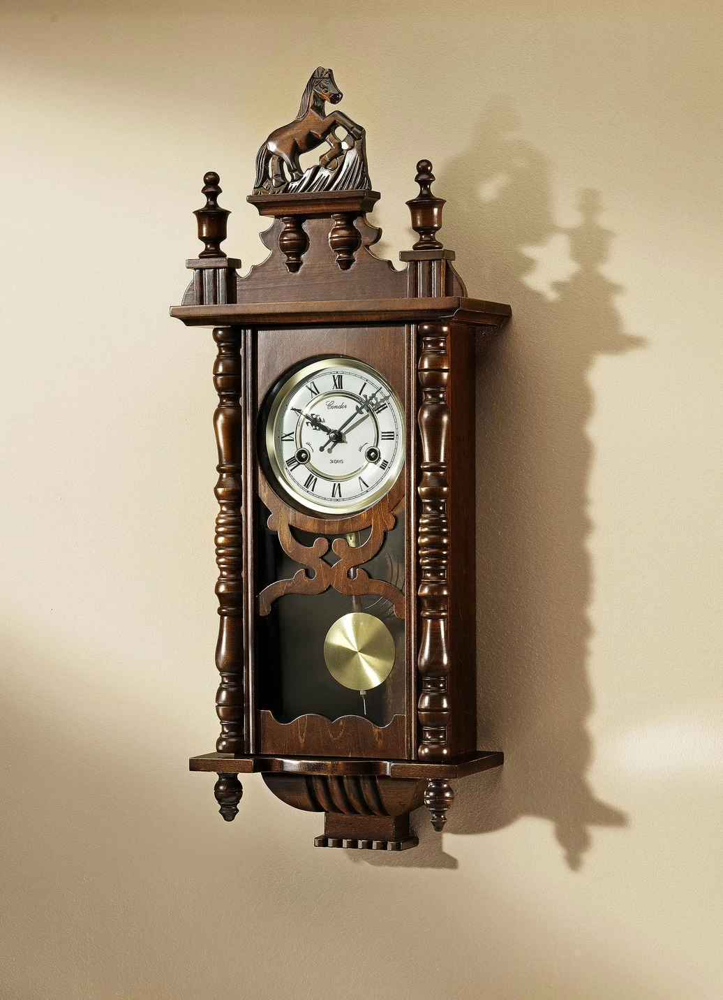 Diese Wanduhr aus Holz wurde sehr eindrucksvoll mit einem Pferd gestaltet. Mit schönen Verzierungen und Drechslereien. Hinter Glas befindet sich das weiße Ziffernblatt mit römischen Ziffern und schwarzen Zeigern sowie einem messingfarbenen Metall-Pendel. Mit Westminster-Quarzuhrwerk sowie Nachtabschaltung. Batteriebetrieben mit 4x 1,5 Volt Mignon (nicht im Lieferumfang enthalten).