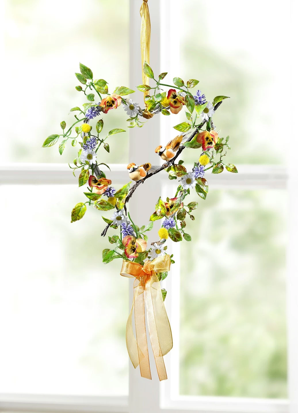 Wunderschönes Weidenherz aus Kunst- und Textilmaterial, mit Margeriten, Stiefmütterchen und grünem Beiwerk. Als besonderes Highlight sitzen 2 kleine Vögelchen auf einem Ast, die aus Styropor gefertigt und mit Hühnerfedern verziert sind. Das farblich passende Textilschleifenband rundet das Arrangement geschmackvoll ab.