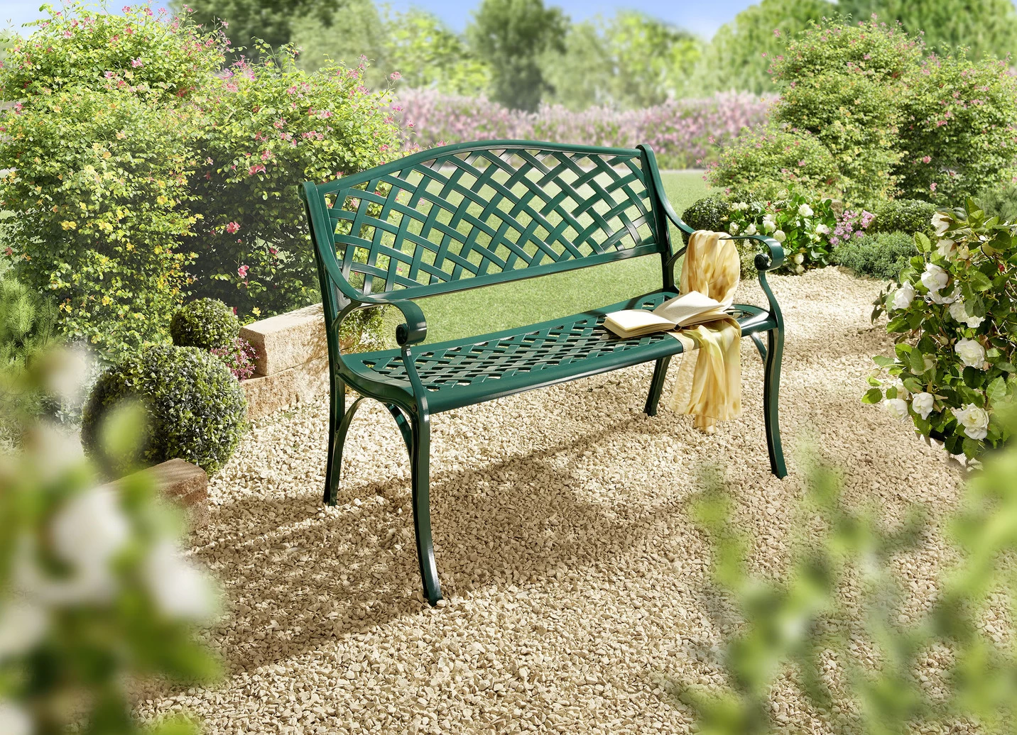 Zeitlos elegante Gartenbank aus hochwertigem, stabilem aber dennoch leichten Aluguß. Wetterfest und rostfrei, somit ideal für den ganzjährigen Außeneinsatz. Sitz- und Rückenteil sind ergonomisch geformt und mit dekorativem Kreuzmuster versehen. Mit Aufbau- Anleitung.