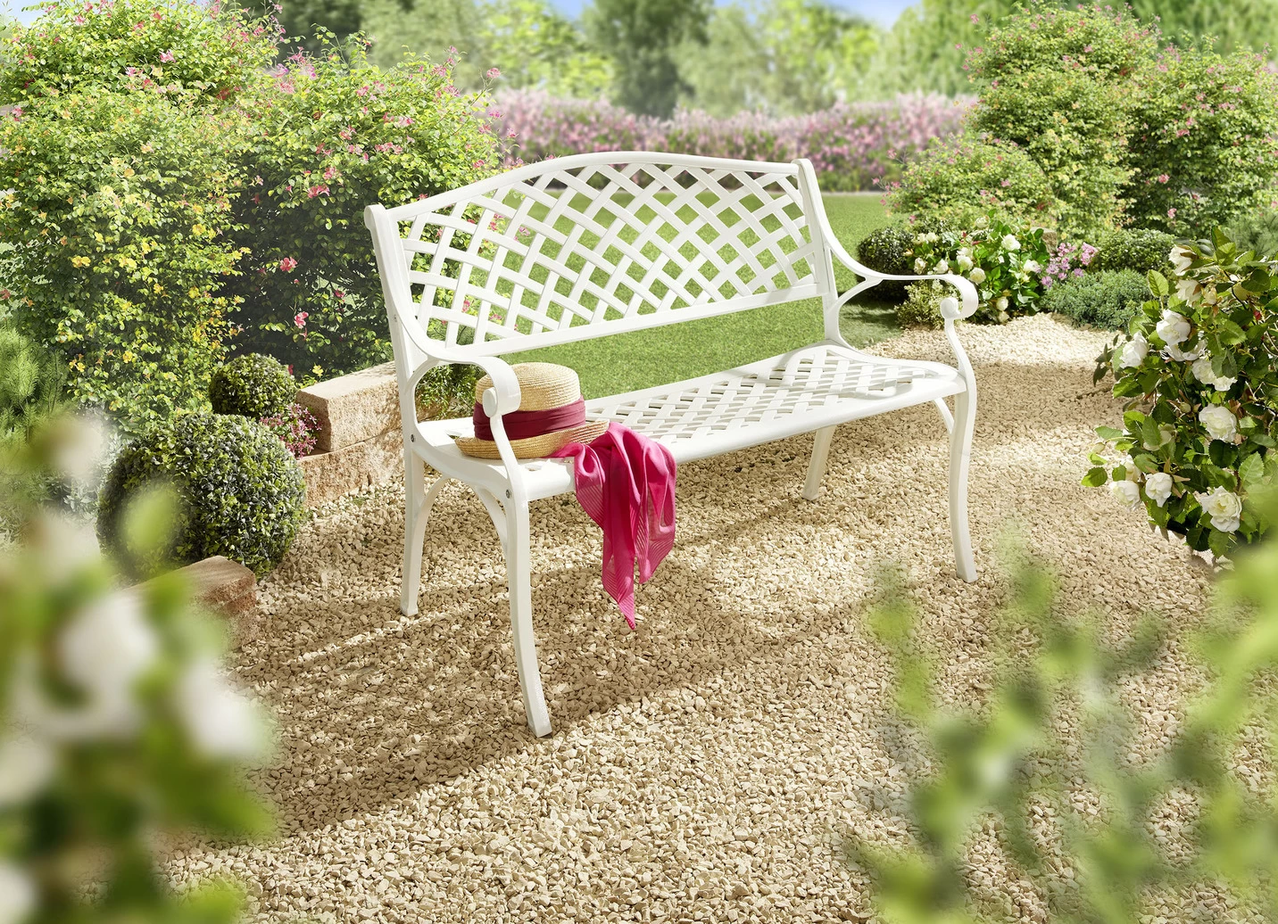 Wetterfeste 2-Sitzer-Gartenbank aus leichten Aluguß in Weiss.