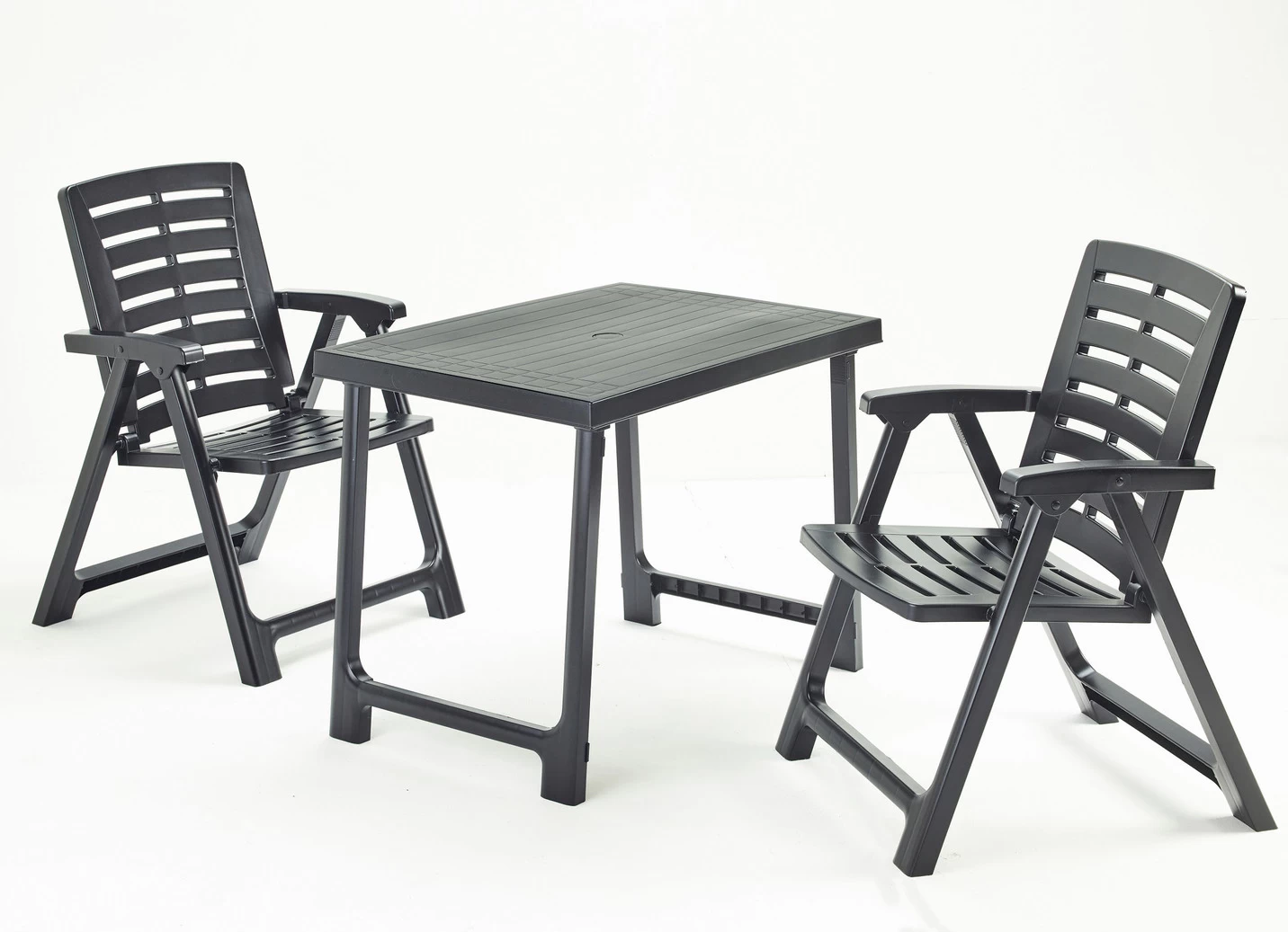 3-teiliges Möbel-Set, bestehend aus 2 Klappsesseln und 1 Tisch. Ideal für Garten, Balkon oder Terrasse. Die Sessel lassen sich platzsparend zusammenklappen und verstauen. Tisch mit Aufbau-Anleitung.