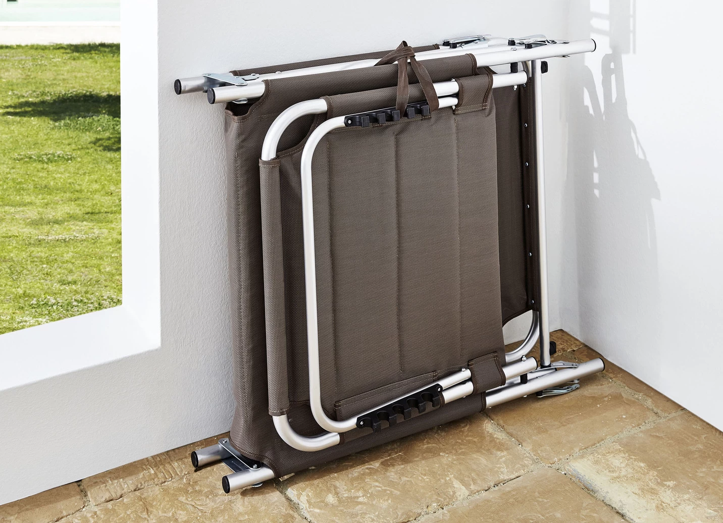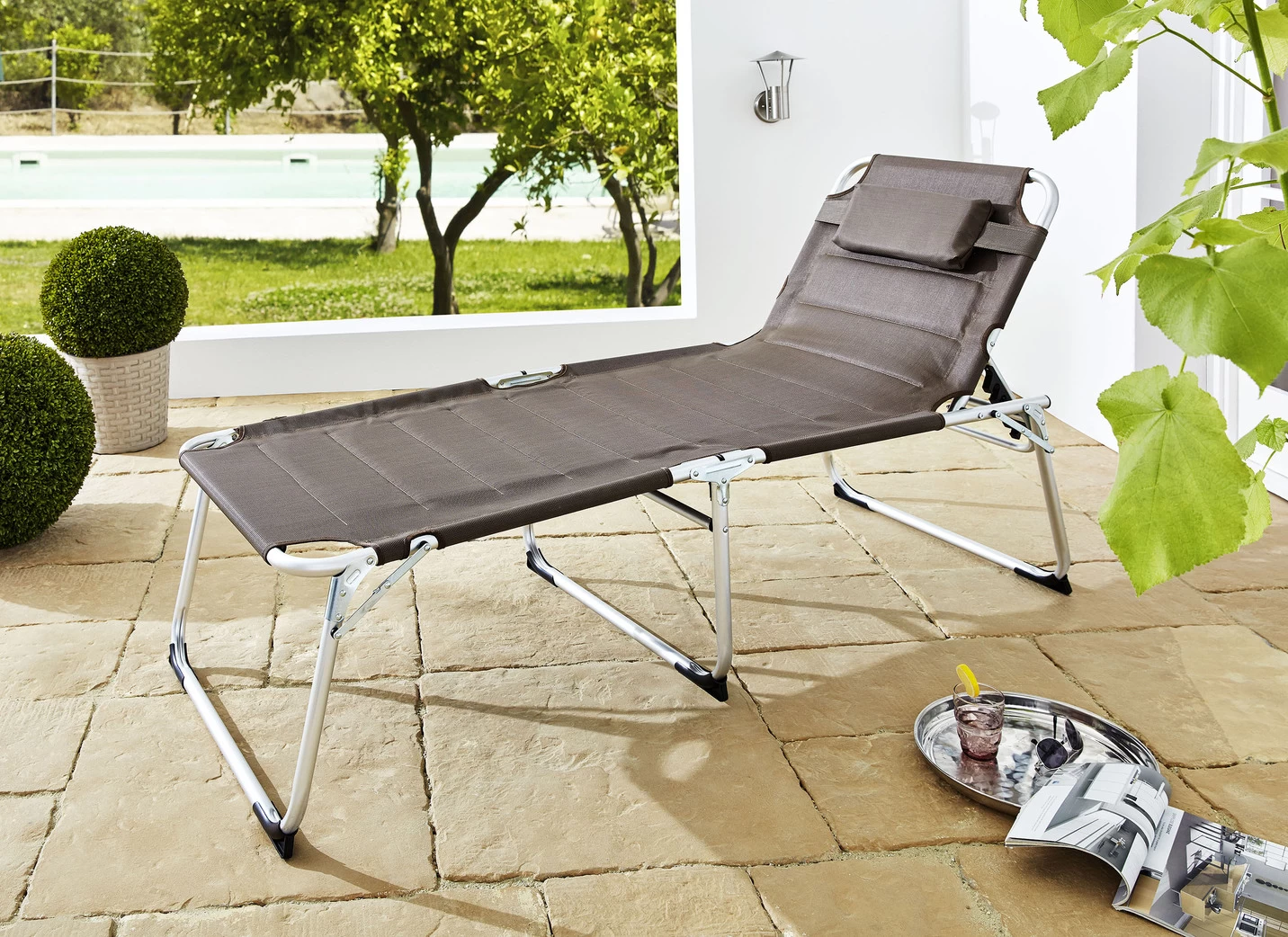 Extragroße Liege mit 4-fach verstellbarer Rückenlehne aus pulverbeschichteten Aluminiumrohren, bis 150 kg belastbar.