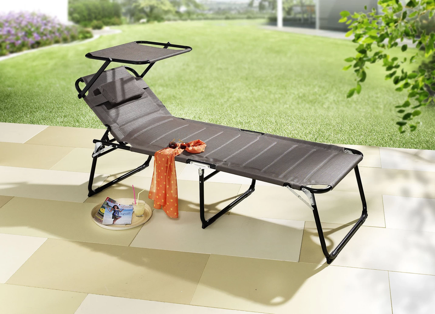 Diese extragroße Liege mit Dach und 4-fach verstellbarer Rückenlehne besteht aus pulverbeschichteten Aluminiumrohren und ist bis 150 kg belastbar.